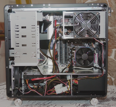 The case's design also helps keep the system cool (Figure 3). This Lian-Li V1000B Mid-Tower case is broken into three compartments: one for the hard drives (lower left), one for the power supply (bottom right) and then the upper compartment for the rest of the system. This breakdown creates three separate cooling zones, using small slots to pass cables through without letting too much heat travel within the machine as well.
