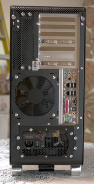 Figure 5. The back panel offers most of the hookups, along with many spots for ventilation, including mesh and cut-outs for fans.