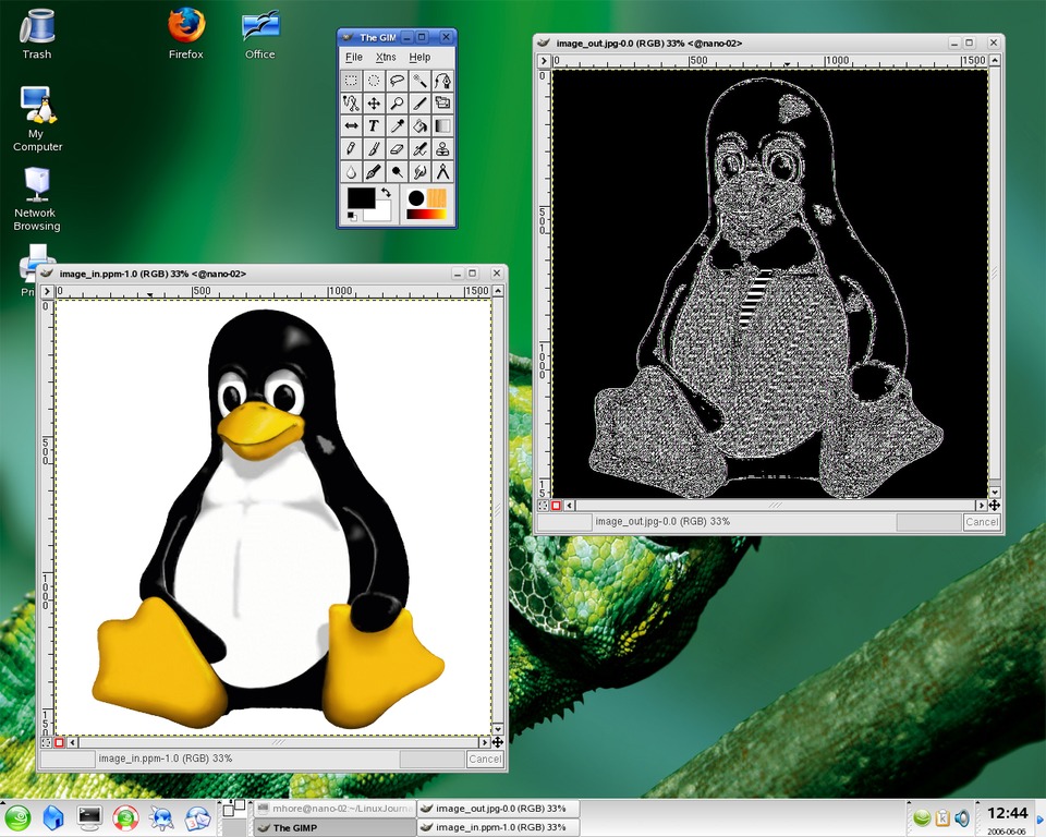 Now that we have each node storing a piece of the image for processing, we need to apply the filter to the image. The GIMP Documentation Team has done a good job of describing how to do this using a convolution matrix in the GIMP Documentation. Many image effects—such as sharpen, blur, Gaussian blur, edge detect and edge enhance—have unique matrices that provide the desired effect. The convolution matrix works by studying each pixel of an image and changing its value based on the values of neighboring pixels. We consider the edge detect matrix in this article, shown in Figure 2.