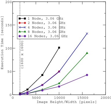 To put some numbers to the performance of our image-processing program, one 3.06GHz machine takes about 50 seconds to read, process and write a 6,400 x 6,400 image to disk, whereas 16 nodes working together perform this task in about ten seconds. Even at 16,000 x 16,000 pixels, 16 nodes working together can process an image faster than one machine processing an image 6.25 times smaller.