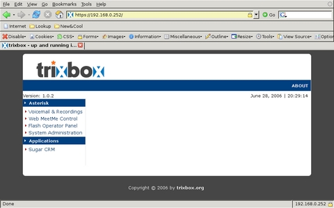 After downloading the Trixbox ISO, I burned it onto a CD and booted the system from it. I was presented with a screen that told me that continuing will completely destroy any data on the hard drive. Willing to do that, I pressed Return to continue. The install process asked me to select a keyboard type and layout, a time zone and a root password. There seemed to be some very long pauses between these selections, but the system completed the install and configured the bootloader. At that point, with the base system installed and the network configured, it rebooted.