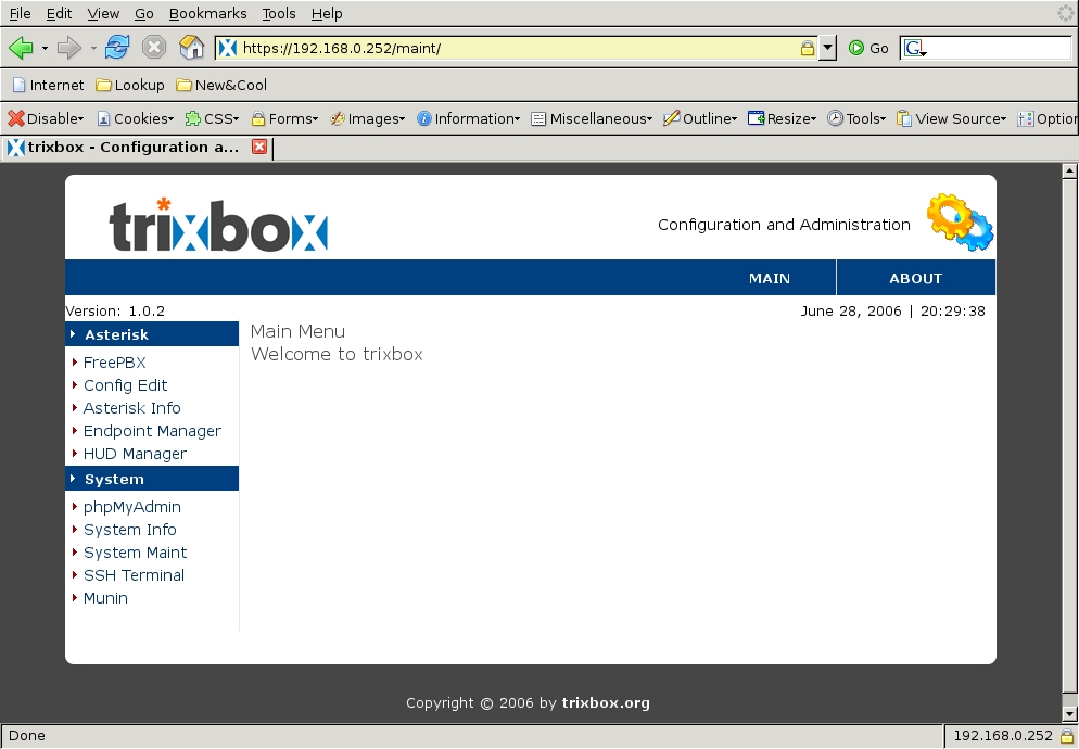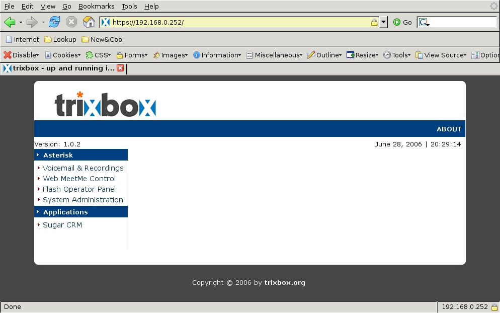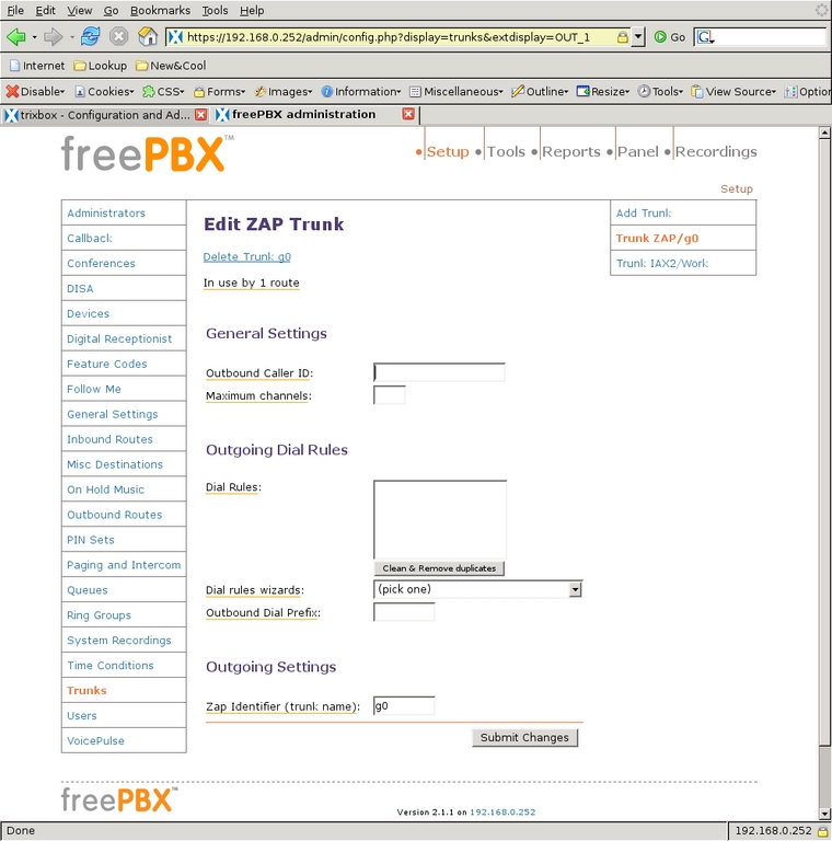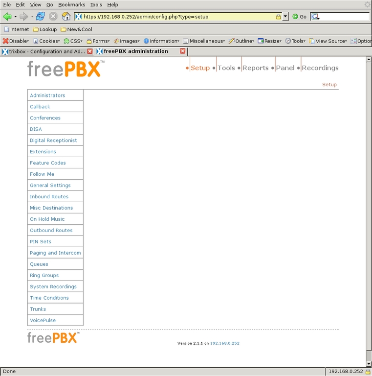 After coming back up, it retrieved the Trixbox software itself, built and installed everything and initiated another reboot. At reboot, it finished the installation of FreePBX and restarted. These reboots were a bit disconcerting at first, but by this point, the entire system was fully installed and running. However, it did not recognize or configure my TDM card.