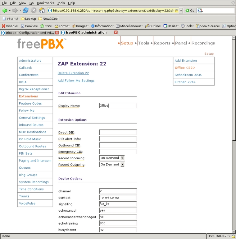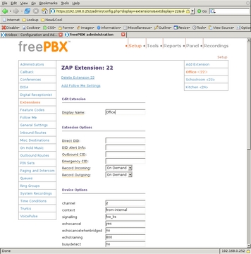 After selecting Extensions from the left-side menu, I chose to Add a ZAP extension. I gave extension number 22, display name Office and channel 2 to my office phone. Giving it channel 2 means it is plugged in to socket 2 on the Digium PCI card.