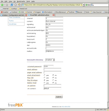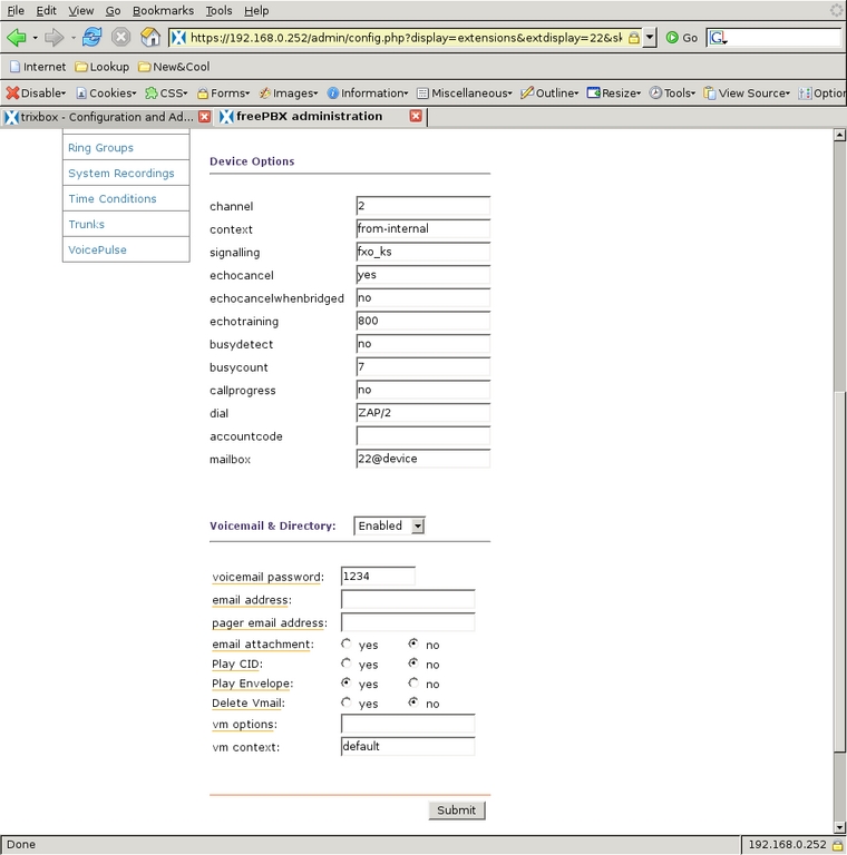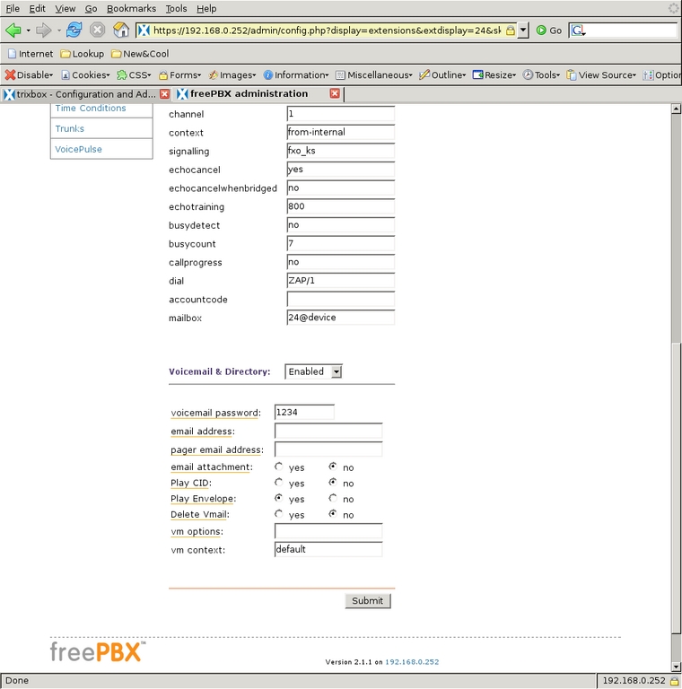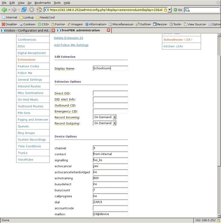 I then enabled voice mail on that channel and assigned the required voice-mail password. After selecting Submit, the new channel appears in the right-side menu. When it is selected again from the menu, the Device Options have more parameters that could be modified, but the defaults are sufficient (Figures 10 and 11). Extension 24, assigned to the Kitchen phone on channel 1, is configured similarly (Figures 12 and 13), and the voice mail on this extension is the family voice-mail box. The Schoolroom, assigned extension 23 and channel 3, is also similar but voice mail is left disabled (Figure 14). That completes all three of the real extensions on the system.