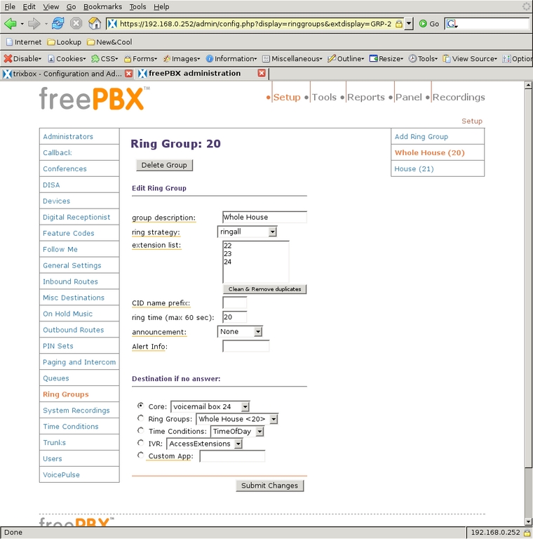 I also designed one pseudo-extension that will ring the whole house and another to ring only the Kitchen and Schoolroom phones. I used Ring Groups for this. A Ring Group is a set of extensions that are associated with each other, can be dialed with a single number and can ring in a specific order. Selecting Ring Groups from the left-side menu, I defined group number 20 for the whole house. I put all three real extensions into the extension list and set them to all ring at once, which is the strategy ringall (Figure 15).