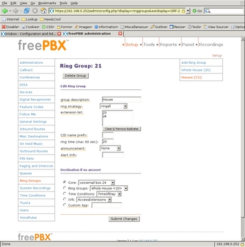 I set the ring time to 20, the same timeout as the other extensions, and if no one answers, the call will go to the family voice-mail box (24). Making a ring group for the house extensions is exactly the same, but only extensions 23 and 24 are in the list (Figure 16). These ring groups can be dialed from any internal extension or from an incoming call that is allowed to dial extensions directly. One nice thing about using these ring groups is that during the school year, I can drop the extension in the Schoolroom from the ring group, so people in that room are not disturbed during the day. In the summer, I can add that extension back into the group.