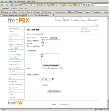 Although calling between extensions is certainly cool and useful, calling out of the system is still required. Outbound Routes is where that gap is bridged. For ease of configuration and for faster parsing of dialed numbers, I configured the system so that all numbers dialed out through the phone company will be prefixed with the digit 9. Selecting Outbound Routes from the left-side menu, I defined a route called 9_outside (Figure 17) for passing outgoing numbers to the PSTN trunk, which is ZAP/g0.