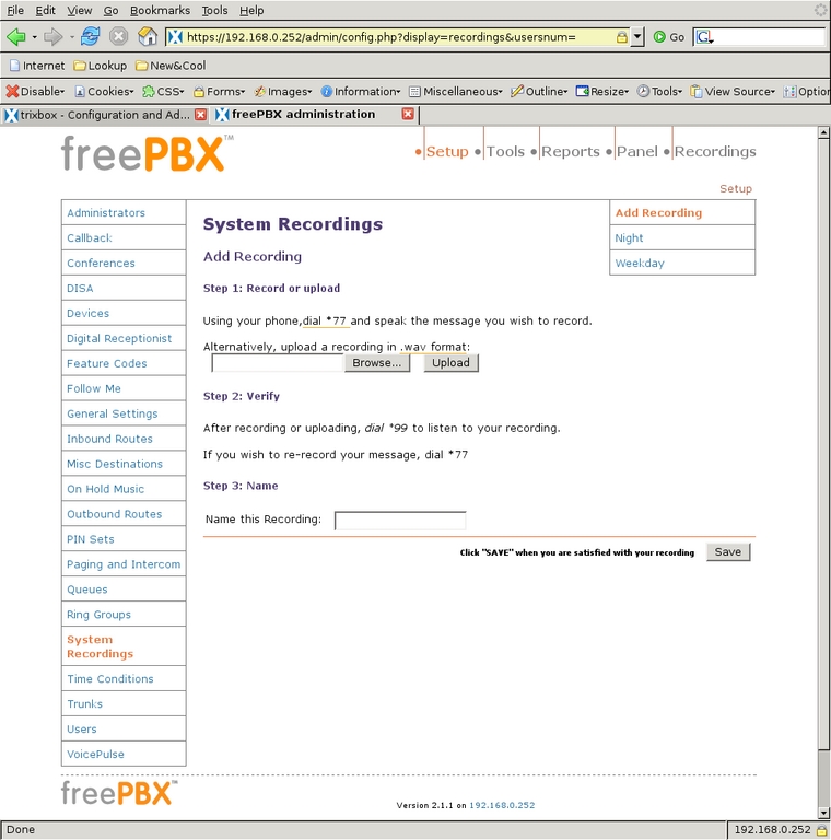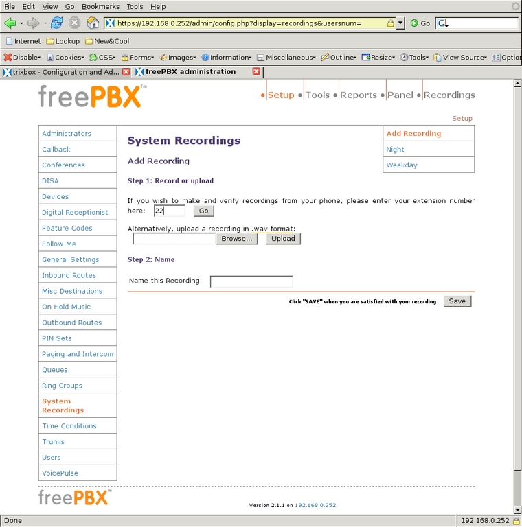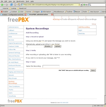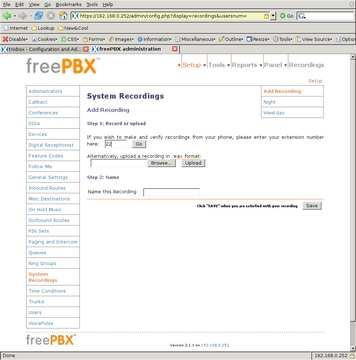 To keep the system simple, I used only two outgoing messages. The first, titled Night, says: “We are unavailable at this time, please press 1 to leave a message, or if this is an urgent matter press 0 to ring all the phones.” The second message, titled Weekday, says: “Thank you for calling. To ring the house, enter 21; to ring the office, enter 22; to ring all the phones, enter 20 or stay on the line.” Using these scripts, I select System Recordings from the left-side menu and select Add Recording to get to the first screen (Figure 18). It is possible to upload a WAV file directly, but I used an extension to record directly into the system. After clicking Go, I saw the screen shown in Figure 19 with instructions for recording the message. After recording each message to my satisfaction, I gave the recording its name and clicked Save.