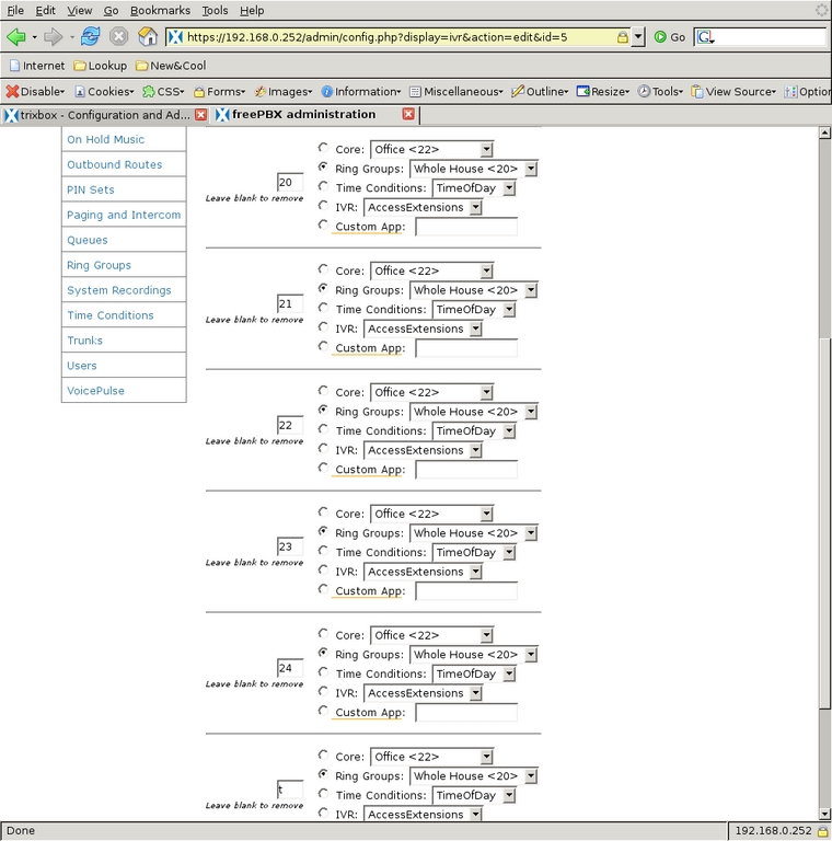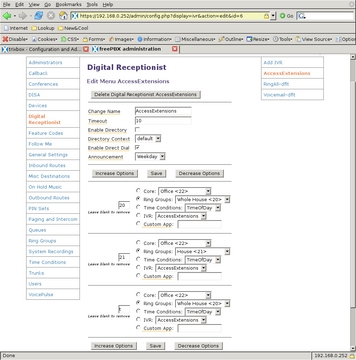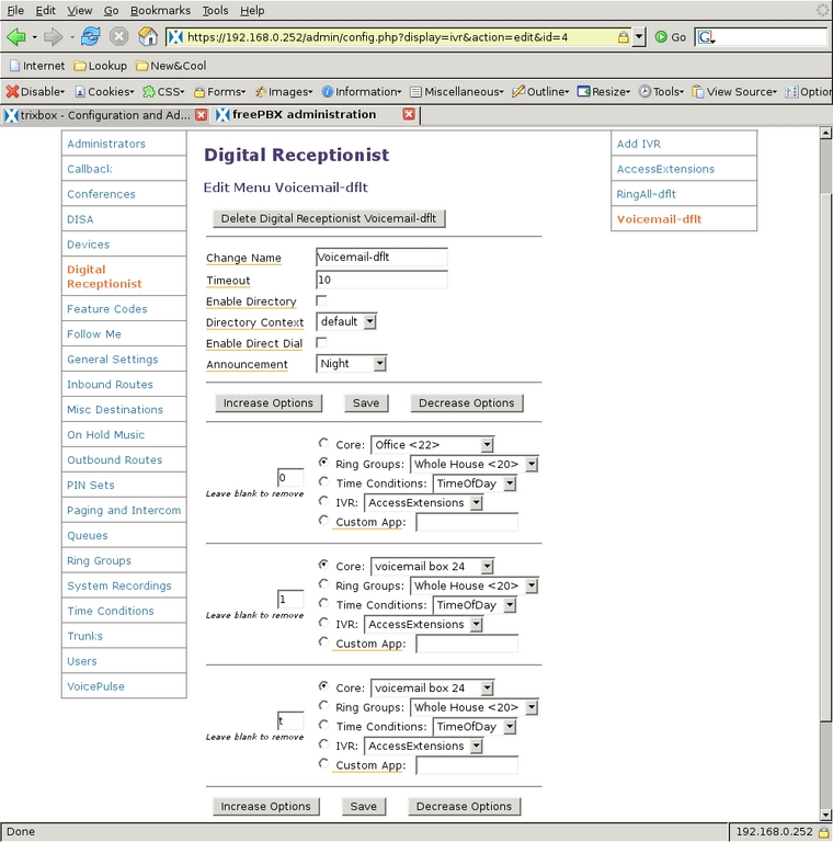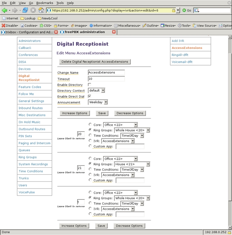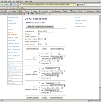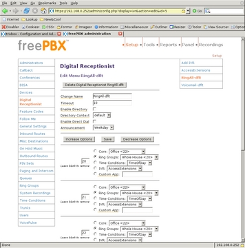 The Digital Receptionist is only a bit more complex with three menus. I defined each of these by selecting the Add IVR link at the top of the right-side menu. The configuration of a Digital Receptionist menu is quite straightforward, once a person knows what each option does. The general section at the top allows for defining or changing the name of the IVR; next, is the number of seconds the caller has to enter an option, after which the t option is used; Enable Directory and Directory Context allow the caller to go to the automated directory system by entering #; Enable Direct Dial means that the caller can enter directly any extension defined in Extensions; Announcement is the audio message played to the caller before making the dial options available. Below the general section are other choices callers can select to take them to other parts of the system. Options for the caller to enter must not conflict with any Extensions. What can be chosen for destinations depends on the modules installed in the system, and most are self-explanatory. One of the possible destinations is another IVR menu that allows for very powerful cascading menu systems.