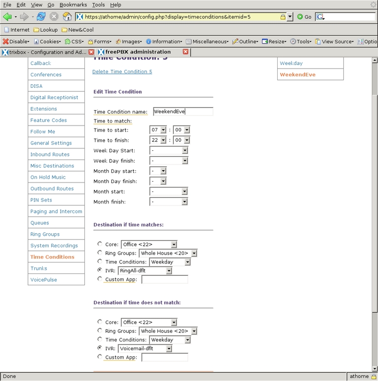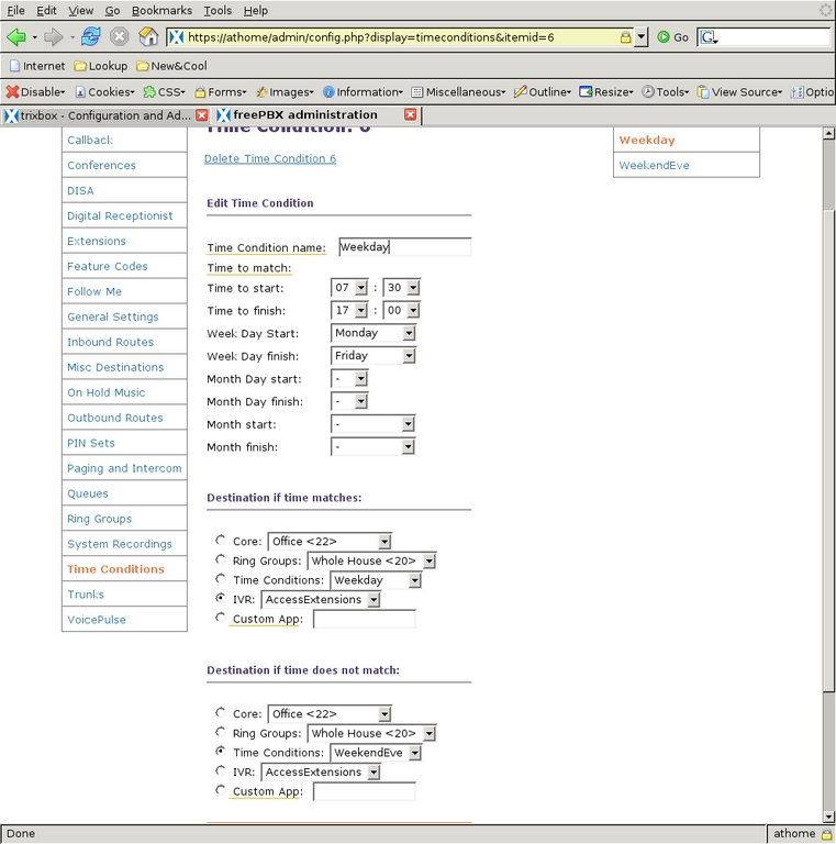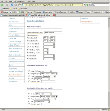 Next, to define which of the Digital Receptionist contexts handles calls based on the time they are received, I used Time Conditions. There are three categories of time I want to differentiate: the normal workday, non-workday waking hours and everything else. I first defined the weekend and evening Time Condition (Figure 24) so that calls between 7 am and 10 pm (22:00) go to the RingAll-dflt IVR, and outside of that time, calls are handled by Voicemail-dflt. Then, I created a Time Condition to handle the weekday times (Figure 25), which checks to see whether the time is during the work/school day, and if so, it passes the call to the AccessExtensions IVR. If it does not match, it is passed to the WeekendEve condition for further testing. So, if a call comes in on Monday through Friday and between 7:30 am and 5 pm (17:00) the AccessExtensions IVR handles it. If a call is not in that time frame, the WeekendEve Time Condition takes control. If the call is between 7 am and 10 pm any day of the week, the RingAll-dflt IVR handles the call; otherwise, the Voicemail-dflt IVR takes control.