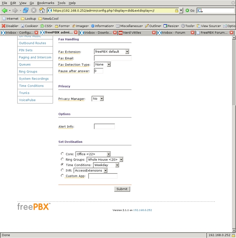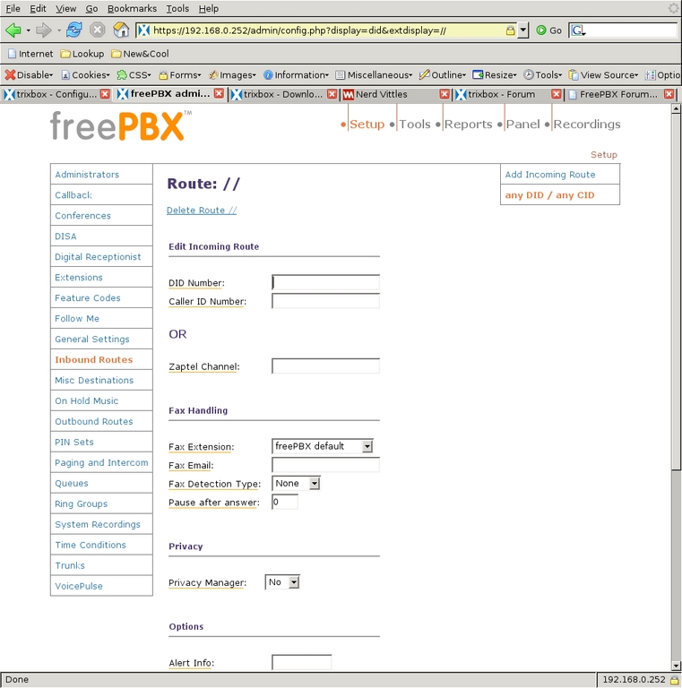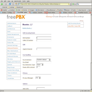 The Inbound Route screen also allows for fax handling and setting a distinctive ring on SIP phones (but not for ZAP channels). For added security against phone solicitors, the Privacy Manager can be activated, requiring callers with no caller ID to enter their phone number before proceeding through the system. I do not have caller-ID service, so I left that off. I have found that the phone system itself deters many of the automated phone solicitations we used to get.