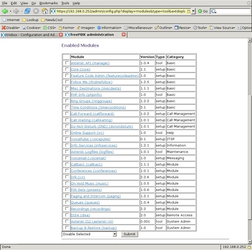 After reboot, I opened a browser window and directed it to the static address I defined. I then saw the initial Trixbox screen, as shown in Figure 1. Most configuration is done through FreePBX, which is found by selecting System Administration, entering the maint user name and the password from above (Figure 2) into the pop-up window and then selecting FreePBX. The FreePBX is very modularized, and those modules still needed to be installed and activated before I could do anything with the system. By first selecting Tools from the top menu and then Module Admin from the side, I was at the module management screen. I then selected the Connect to Online Module Repository link to view all the modules available. I selected all the Local modules and clicked the Submit button at the bottom of the table. Next, I downloaded and installed all the Online Modules except for Gabcast and Java SSH.