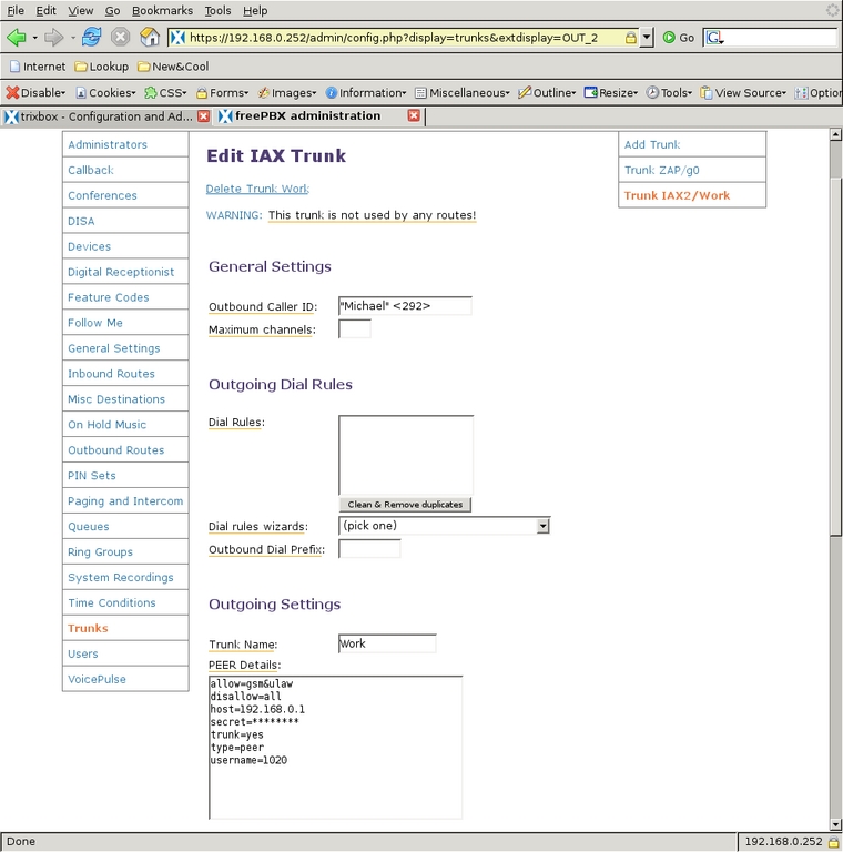 Another trunk I defined is an IAX2 trunk that connects to the office PBX, so I can receive calls sent to my work extension and make calls through the office account. Starting from the Add a Trunk screen (Figure 6), I selected Add IAX2 Trunk and filled in the configuration page for the trunk. Figures 8 and 9 show the configuration of that trunk. The PEER Details, USER Details and Register String have been changed to remove the IP address and passwords for the work system, but all these settings are present by default when the trunk is created. Usually only the address, user name and secret need to be changed. Two things to note here: