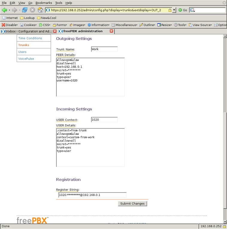 Once I filled in all the parameters, I selected the Submit Changes button to create the trunk. Then, as with all changes to the configuration, the interface displayed the red bar at the top of the screen for committing the changes to the system. With the trunks defined, there is now a way for calls to arrive in to and depart from the system.