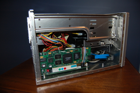 After deciding on the form factor and motherboard, I had to choose a case and power supply that would provide enough space to fit a PCI hardware RAID controller, the Mini-ITX motherboard and two full-size hard drives, while complying with my general requirements. I compared a large number of Mini-ITX cases. I found only one, the Silver Venus 668, that was flexible enough to support everything I needed. After choosing the motherboard and case, I looked at the RAM requirement, and I chose 512MB of DDR266 RAM. I had great difficulty finding US Mini-ITX distributors. Luckily, I found a company, Logic Supply, which provided me with the motherboard, case, power supply and RAM as a package deal for a total of $301.25 US, including shipping. At this point, I had all of the components except the RAID controller and hard drives.