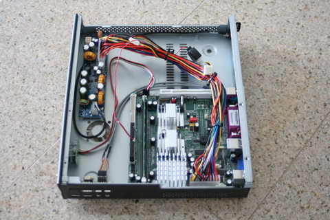 To give the appliance a sleek look, I went with a Casetronic C158 case. This case has a smooth front, which makes it look more like an appliance. Even though the case has room for a slim ROM drive, I did not put one in, because MPD does not have support for playing audio from a CD. The case also has audio jacks on the front right side that provide easy access for enjoying music with headphones. Another nice feature on this case is the optional CompactFlash card reader that can be mounted from the inside and accessed right below the CD-ROM tray.