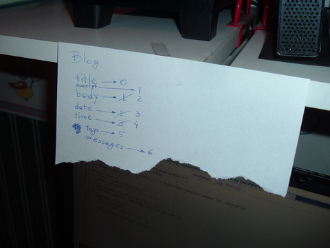 This might be a good solution if we want to store only a title and a body. But, how long until we want to add the date and time, excerpts, tags or messages? You may begin thinking you'll need to hang a sheet of paper on the wall, as shown in Figure 1, to remember the index of each field—not pleasant at all. To solve this problem, and some others, Python gives us object-oriented programming.
