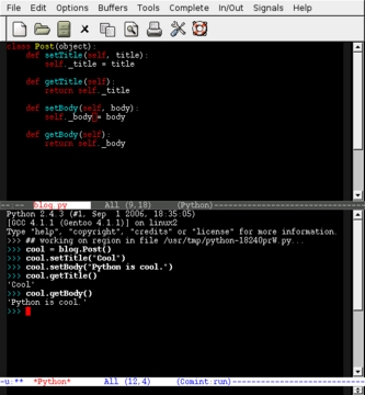 You can, of course, do the same without Emacs. But for that, you need to learn how Python modules and packages are made. Set PYTHON_PATH, an environment variable, accordingly, and use the built-in function reload. With Emacs, you'll find iterating between coding and testing the code to be very fast. This speed can improve your performance and make programming more fun. In fact, Lisp programmers have been advocating this way of working for more than two decades.