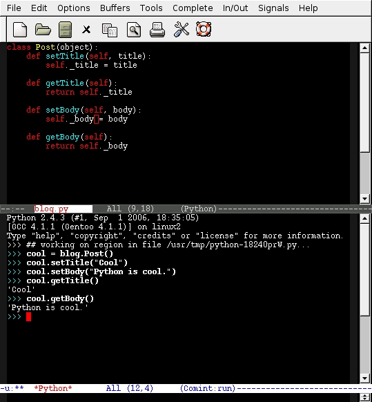 Suddenly the window is split, and you have an embedded Python interpreter below the file you are editing (Figure 2). And the fun is only beginning. Click on the file you are editing to set the focus on it. Run Import/reload file from the Python menu or press Ctrl-C Enter. Now, you're ready to test your code on the REPL, but be aware that you'll have to add blog. before the name of the class, Post, because now the class is in the module blog. See Figure 2 for further reference.
