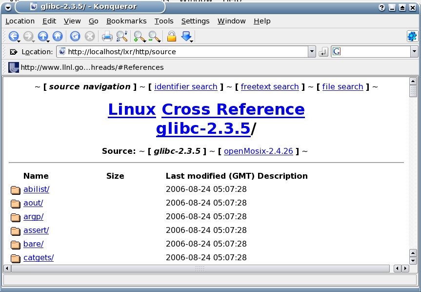 Now, cd to the directory where LXR was installed (in my case that was /var/www/htdocs/lxr). Three subdirectories should be there: bin, http and source. Although the source code you want to cross-reference can be placed anywhere, I prefer to put it under the $INSTALLPREFIX/source subdirectory. I put the glibc-2.3.5 and OpenMOSIX-2.4.26 source code here. Now, we have to generate the index files that LXR will use to generate the cross-referenced source code. So, cd to the directory with the source code, and execute the genxref script in $INSTALLPREFIX/bin: