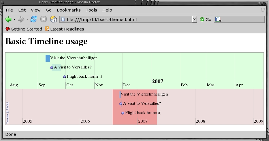 Listing 4 shows the changes needed for the previous HTML file to modify the band colors and font information. After including the timeline-api, we override two of the CSS classes to change the font color and enlarge the major date markers. The band colors and click bubble size are properties of the theme object. This modified theme object is then passed as a parameter to the Timeline.createBandInfo() function when creating the bands. The result is shown in Figure 2.