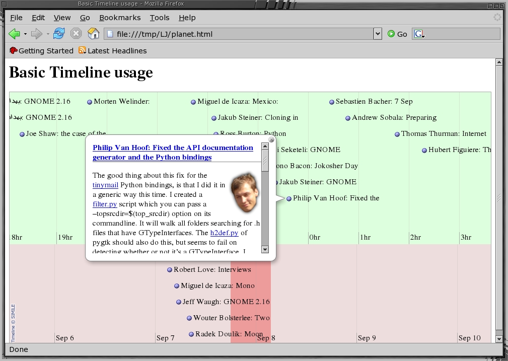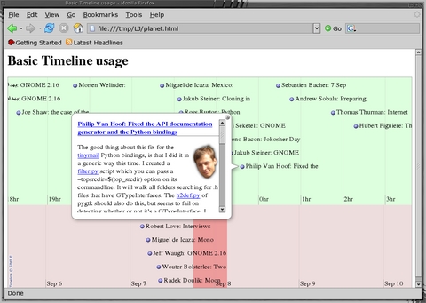 Timeline lets you view points and durations of time in an intuitive manner. I refer to these as time events or just events when the context is clear. Many bands at different granularities—hour, day, month, year and so on—can show you how events relate to each other. You can use the mouse to drag around the display, or double-click on the Timeline to center at that time. All events can have click bubbles showing a little HTML with links and images.