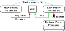 Priority inversion is illustrated by Figure 9. A low-priority process P2 holds a lock, but is preempted by medium-priority processes. When high-priority process P1 tries to acquire the lock, it must wait, because P2 holds it. But P2 cannot release it until it runs again, which will not happen while the medium-priority processes are running. So, in effect, the medium-priority processes have blocked a high-priority process: in short, priority inversion.