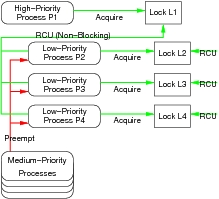 A key property of RCU is that writers never block readers, and, conversely, readers do not block writers from modifying a data structure. Therefore, RCU cannot cause priority inversion. This is illustrated in Figure 12. Here, the low-priority processes are in RCU read-side critical sections and are preempted by medium-priority processes, but because the locks are used only to coordinate updates, the high-priority process P1 immediately can acquire the lock and carry out the update by creating a new version. Freeing the old version does have to wait for readers to complete, but this freeing can be deferred to avoid degrading real-time latencies.