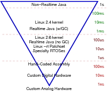 The -rt patchset turns Linux into an extremely capable real-time system. Is Linux suited to all purposes? The answer is clearly no, as can be seen from Figure 14. With the -rt patchset, Linux can achieve scheduling latencies down to a few tens of microseconds—an impressive feat, to be sure, but some applications need even more. Systems with very tight hand-coded assembly-language loops might achieve sub-microsecond response times, at which point memory and I/O-system latencies loom large. Below this point comes the realm of special-purpose digital hardware, and below that the realm of analog microwave and photonics devices.