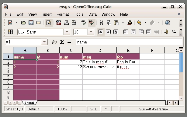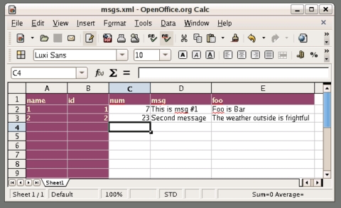 bash-$ ooffice msgs/msgs.xmlThe final command in Listing 8 opens the virtual spreadsheet document, which should look similar to Figure 1. I then changed some data in the second row and saved the file giving the result shown in Figure 2.
