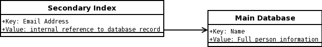 The above example can be implemented by having the primary key-value data stored with the person's name as the key and a secondary index on the e-mail address(es). This setup is shown in Figure 1. I refer to the database with the name-to-person data mapping as the main database and the e-mail look-up database as the secondary index.