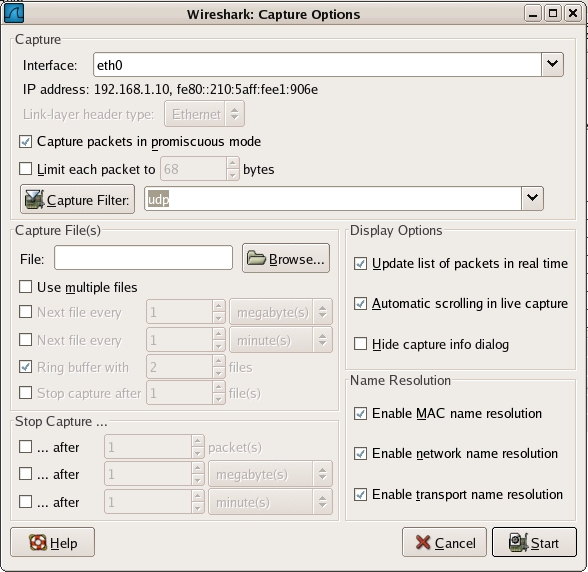 Launch Wireshark as root, and select Capture→Options to bring up the Capture Options dialog, as shown in Figure 1. Ensure that the correct interface is being used; otherwise, you won't see the traffic. In this example, I am capturing traffic on the PBX's only interface, eth0.