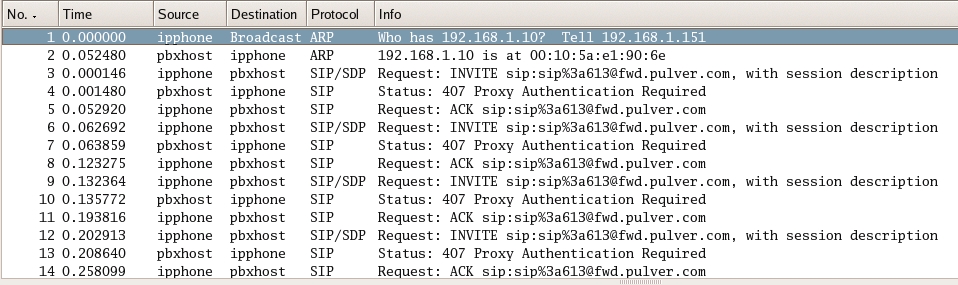 A cursory examination of the information in Figure 2 shows that the same three packets repeat themselves four times. First, the ipphone host sends a SIP INVITE message to pbxhost, which is used to open a conversation. Next, the PBX responds with “407 Proxy Authentication Required” to which the phone responds with an ACK, and then tries again in packet 6. Because this process repeats itself continuously, it's a good guess that the phone is trying to authenticate with the wrong user name and password.