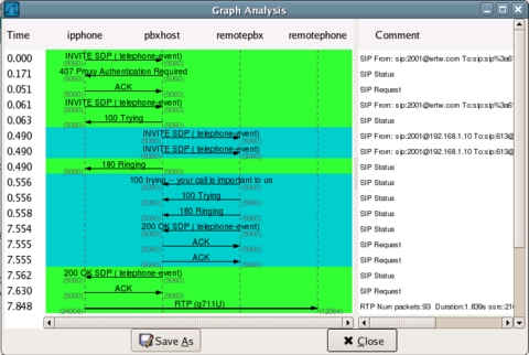 The Graph Analysis dialog shows the SIP messages sent by the various parties. The first message in Figure 3 is an INVITE message, which is the first step in setting up a call. In this case, the IP phone is asking the PBX to place a call to a SIP address of sip:613@fwd.pulver.com, which is an echo service provided by Free World Dialup for testing SIP calls. The response to this is a request for authentication, which is acknowledged. The phone tries again and is given a status of “Trying” by the PBX. The PBX then proceeds to INVITE the remote endpoint by contacting fwd.pulver.com. Several more messages are exchanged before the call is set up properly.