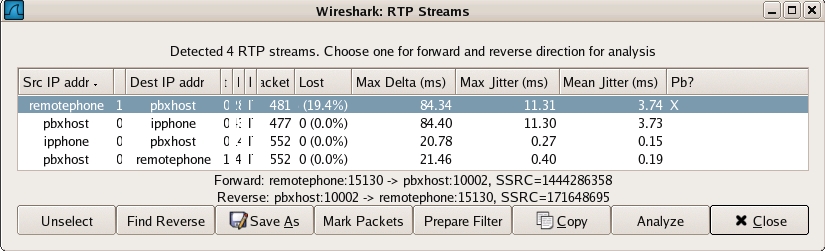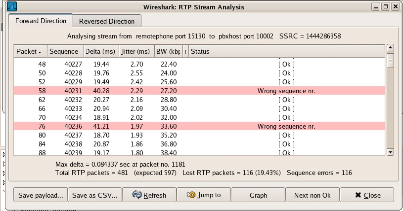 Select the problematic stream for further analysis by clicking on it. After that, click on the Find Reverse button to select the other half of the conversation. Finally, click on Analyze to provide a packet-by-packet look at the stream. Lost packets will show up as having the wrong sequence number. This screen, shown in Figure 6, also displays helpful statistics, such as the current bandwidth, latency and jitter.