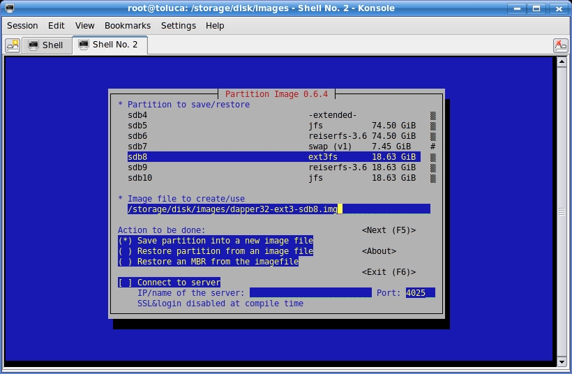 Note that partimage adds numbers to your filename, because it prepares to split up the image into multiple files if necessary. Even if it needs only a single file, it will change the above filename to dapper32-ext3-sdb8.img.000.