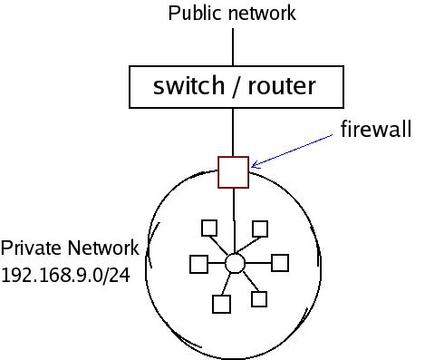 Now, let's get into the implementation details. Assume your private network is 192.168.9.0/24. Your firewall, which is also a gateway, must have two interfaces: one pointing to your network (eth0) and the other connecting to the public network (eth1).