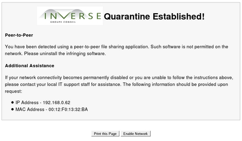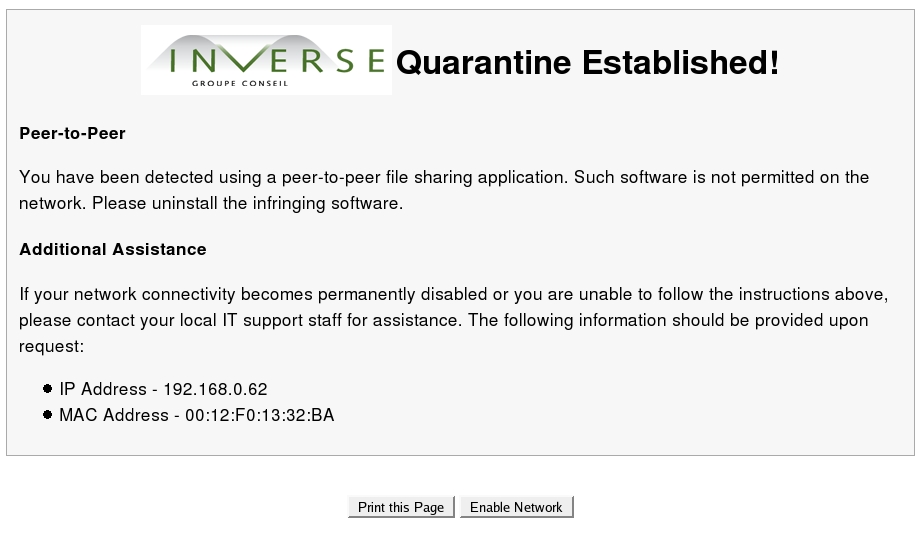 As a user, on your computer, launch your favorite Web browser and try to open any outside Web site. You'll be redirected to the PacketFence system automatically, which will display the peer-to-peer template, as shown in Figure 2.