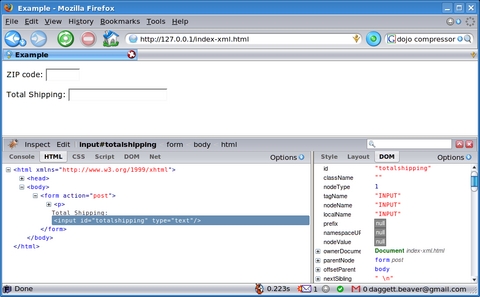 Ajax relies on the DOM to address the various elements within a page. As your page becomes more complex, it gets harder to keep track of all the elements, their names and ids. Firefox has a built-in DOM inspector that is enormously helpful. If that's not enough, you can install the Firebug add-on to Firefox. Firebug not only provides you with a way to examine the DOM, it also helps you debug your JavaScript code and manage your cascading stylesheets (see Resources for a link to the add-on). Figure 1 shows the XML example page as viewed through Firebug. [Reuven Lerner covers Firebug in this month's At the Forge on page 22.]