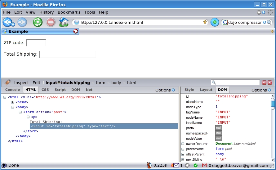 </html>The only thing left is to modify our PHP code to return XML instead of plain text. See Listing 4 for the PHP code. In addition to the XML content itself, note the line of code that sends a header identifying the content as XML before returning the XML content itself. The XML places the shipping amount as a child of <order>, along with the unused data, <total>. This is simply a baby step toward representing a more realistic set of data that the page should return.