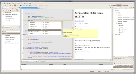 Syntax highlighting is context-sensitive and works quite nicely across mixed HTML, CSS, PHP and JavaScript content. Code completion didn't work on the little PHP I played with, but it worked quite well for JavaScript—the one exception was when I created a variable for a new instance of XMLHttpRequest, the method name code completion didn't initially work for that variable. This seemed to sort itself out though. Code completion on the browser DOM also shows the browser and version of it in which that feature is supported. According to an August 2006 Web interview with Paul Colton, founder of Aptana, the ability to set requirements for a set of browsers and versions and have the IDE flag methods outside these requirements as errors is a planned feature.