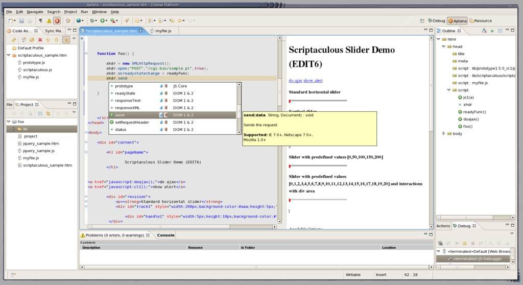 Figure 1. Aptana performing code assist for the send() method of an XMLHttpRequest. Methods for the object are shown, and for the current candidate method, the arguments and minimal browser requirements are shown as extra assistance. The outline view on the far right allows quick navigation through HTML, CSS and JavaScript mixed content. In the middle right is a preview of the current HTML page being edited in the middle left.