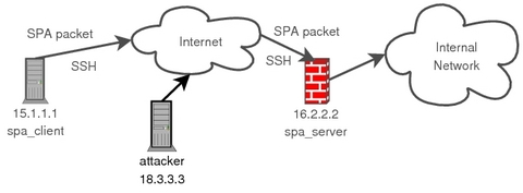 The basic network depicted in Figure 1 illustrates our setup. The fwknop client is executed on the host labeled spa_client (15.1.1.1), and the fwknop server (along with iptables) runs on the system labeled spa_server (16.2.2.2). A malicious system is labeled attacker (18.3.3.3), which is able to sniff all traffic between the spa_client and spa_server systems.