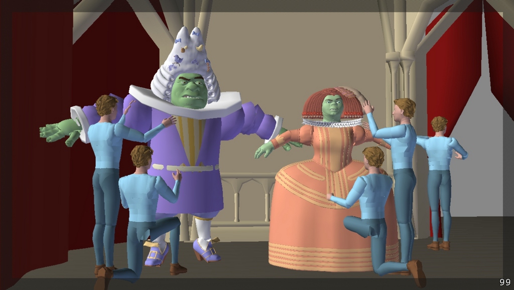 It isn't just the challenge of animating some clothing, it's how much clothing. “We have a lot more characters in the same shot”, notes Shrek 3 Co-Director Raman Hui. “Shrek 3 has a huge cast with 48 characters”, says Shrek 3 Director Chris Miller. “We have huge crowd scenes with 40 to 50 characters on a stage and 2,500 in the audience.” “The challenge in crowds is each character needs to look different”, says Pearce.