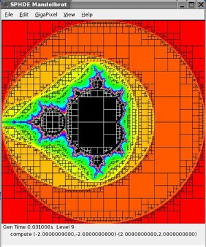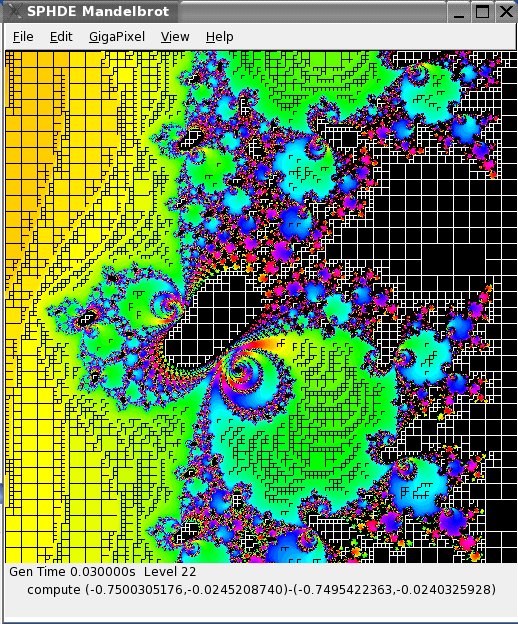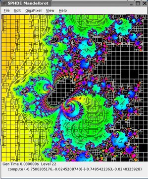 As a demonstration, I wrote a gigapixel Mandelbrot (GTK2) GUI program. This program computes each point in the Mandelbrot set once and saves the resulting image as a quadtree in SPHDE storage. This quadtree representation can be shared and displayed by multiple instances of the program. Program instances can cooperate to fill in the next level of detail.