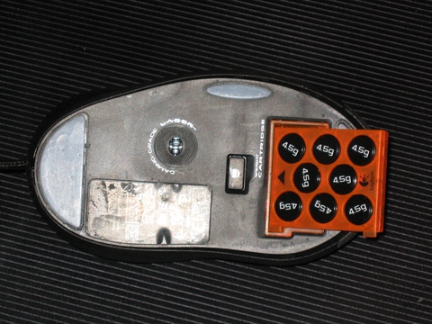 Figure 7. Add as many 4.5 gram weights to the puck as you like, and insert it into the mouse when you're done. This mouse is fully weighted.