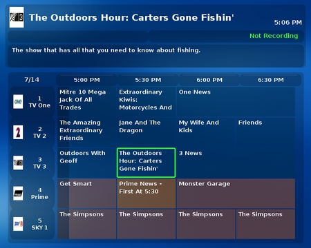 Some other nice touches are a slick default theme, although it is a little like Windows Media Center. The New Zealand channel guides were programmed for us already, as well as little touches like the official channel icons. The unit itself looks very appealing, with a slick black case and muted-blue glowing LCD showing the internal temperature and fan speed.