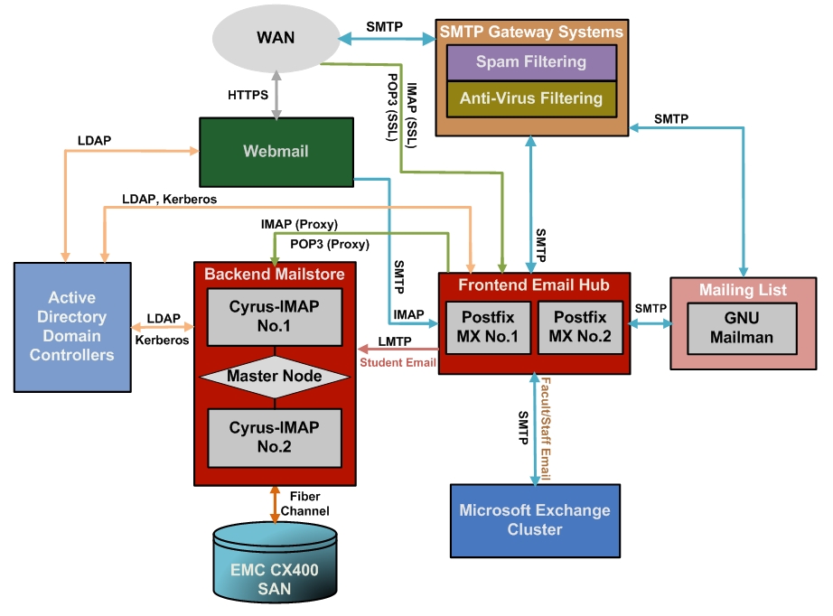 To resolve the existing e-mail performance issues, we conducted brainstorming sessions, requirements analysis, product comparison and test-lab prototyping. We then came up with the design of our new e-mail system: it is named MUMAIL (Figure 2) and uses standard open-source software (Postfix, Cyrus-IMAP and MySQL) installed on Red Hat Enterprise Linux. The core system consists of front-end e-mail hub and back-end e-mail store. The front-end e-mail hub uses two Dell blade servers running Postfix on Linux. Network load balancing is configured to distribute load between them. The back-end e-mail store consists of two additional blade servers running a Cyrus-IMAP aggregation setup. Each back-end node is then attached to a different storage group on the EMC Storage Area Network (SAN). A fifth blade server is designated as a master node to store centralized user e-mail settings. Furthermore, we use LDAP and Kerberos to integrate the e-mail user identities with Windows Active Directory (AD).