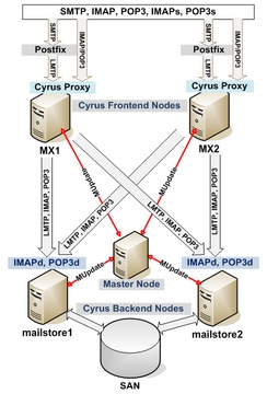 In the mail store setup, instead of using an active-passive high-availability cluster setup, like the HEC approach or the Cyrus replication approach developed at Cambridge, we deployed the Cyrus-Murder Aggregator. Unlike the CMU Cyrus Aggregator server allocation, which uses separate MTA server nodes, we consolidate both MTA and Cyrus Proxy functions to run on our front-end mail hub nodes.