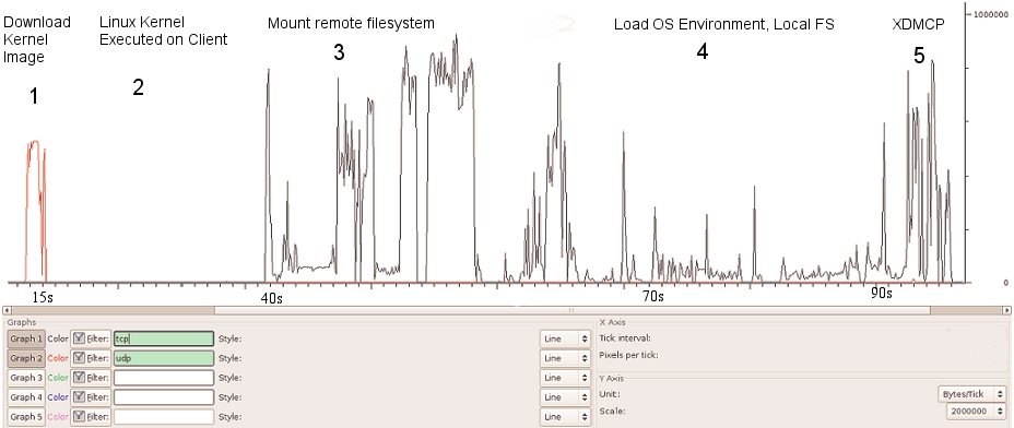 Following the client's BIOS sequence, most machines with network-boot capability will initiate a Preboot EXecution Environment (PXE), which will pass system control to the local network adapter. Figure 1 illustrates the traffic profile of the boot process and the various different stages, which are numbered 1 to 5. The network card broadcasts a DHCPDISCOVER packet with special flags set, indicating that the sender is trying to locate a valid boot server. A local PXE server will reply with a list of valid boot servers. The client then chooses a server, requests the name of the Linux kernel file from the server and initiates its transfer using Trivial File Transfer Protocol (TFTP; stage 1). The client then loads and executes the Linux kernel as normal (stage 2). A custom init program is then run, which searches for a network card and uses DHCP to identify itself on the network. Using Sun Microsystems' Network File System (NFS), the thin client then mounts a directory tree located on the PXE server as its own root filesystem (stage 3). Once the client has a non-volatile root filesystem, it continues to load the rest of its operating system environment (stage 4)—for example, it can mount a local filesystem and create a ramdisk to store local copies of temporary files. The fifth stage in the boot process is the initiation of the X Window System. This transfers the keystrokes from the thin client to the server to be processed. The server in return sends the graphical output to be displayed by the user interface system (usually KDE or GNOME) on the thin client.